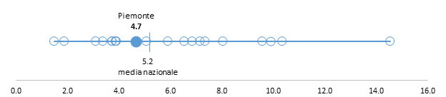 Nei grafici presentati a seguire, viene rappresentato per ogni indicatore l’intero intervallo di variabilità per le 19 Regioni e PA. Il valore dell’indicatore riferito alla Regione in studio è rappresentato dal pallino colorato, mentre la barra verticale corrisponde alla media nazionale. I pallini bianchi rappresentano il valore assunto dall’indicatore nelle altre Regioni e PA.