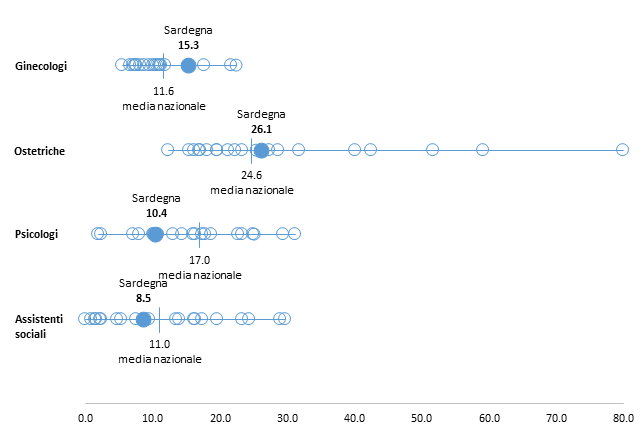 La disponibilità della figura professionale del ginecologo (15,3 ore) è superiore alla media nazionale; sebbene inferiore al gold standard di 18 ore, questo valore colloca le realtà partecipanti della Sardegna in linea con le 5 Regioni con la più elevata disponibilità di questa figura (Figura 7). Anche la disponibilità della figura professionale dell’ostetrica (26,1 ore) è superiore alla media nazionale ma molto distante dallo standard di riferimento di 36 ore.
