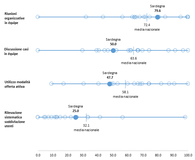Rispetto alla modalità di lavoro multidisciplinare a livello di singola sede, la percentuale di CF che effettuano regolarmente riunioni organizzative con tutte le figure professionali (79,6%) è superiore alla media nazionale mentre la discussione di casi clinici allargata a tutte le figure (50,0%) è inferiore alla media nazionale (Figura 8). La modalità dell’offerta attiva è utilizzata dal 47,7% delle sedi; questo valore colloca i CF partecipanti al di sotto della media, tra le 5 Regioni con il valore più basso per questo parametro a livello nazionale. La rilevazione sistematica della soddisfazione degli utenti è una prassi diffusa in un consultorio su 4, valore al di sotto della media nazionale.