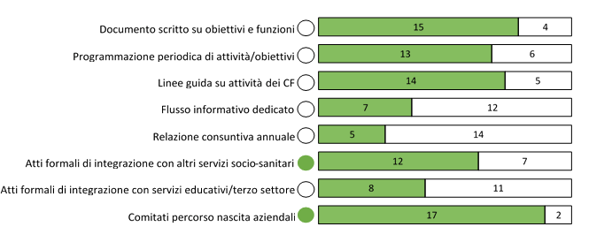 Complessivamente la Regione Umbria manca delle principali attività di governo dei servizi consultoriali censite dall’indagine: non dispone di un documento scritto su obiettivi e funzioni e di linee guida relative alle attività dei CF, non effettua una programmazione periodica delle attività dei servizi consultoriali con obiettivi definiti e misurabili, non ha attivato un flusso informativo dedicato ai CF, non viene redatta periodicamente una relazione consuntiva regionale sulle attività dei CF (Figura 1). In Umbria sono presenti a livello regionale atti formali di integrazione con gli altri servizi territoriali ma non con la comunità (scuola, associazioni di cittadini e di volontariato). Sono stati istituiti i Comitati percorso nascita aziendali che prevedono al loro interno la presenza di un coordinatore/responsabile dei CF.