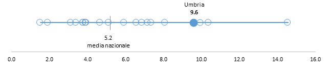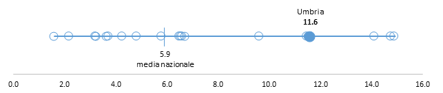 Anche la capacità attrattiva dei consultori rispetto agli adolescenti e ai giovani di 14-19 anni (11,6%) è superiore alla media nazionale e colloca l’Umbria fra le 4 realtà (3 Regioni e 1 PA) con il valore più elevato relativamente a questo indicatore, fra le 6 in Italia con un valore pari o superiore al 10% individuato nella presente indagine come lo standard al quale tutte le Regioni potrebbero tendere (Figura 4).