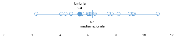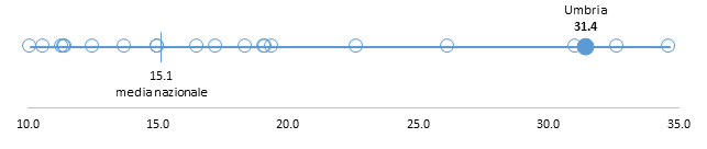 Nei grafici presentati a seguire viene rappresentato per ogni indicatore l’intero intervallo di variabilità per le 19 Regioni e PA. Il valore dell’indicatore riferito alla Regione in studio è rappresentato dal pallino colorato, mentre la barra verticale corrisponde alla media nazionale. I pallini bianchi rappresentano il valore assunto dall’indicatore nelle altre Regioni e PA.