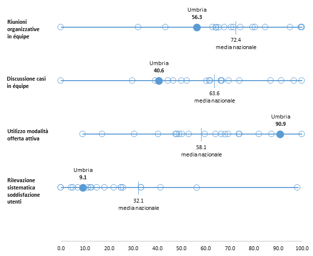 Rispetto alla modalità di lavoro multidisciplinare a livello di singola sede, la percentuale di CF che effettuano regolarmente riunioni organizzative con tutte le figure professionali (56,3%) è molto inferiore alla media nazionale, così come la discussione di casi clinici allargata a tutte le figure (40,6%); per entrambi questi indicatori solo 3 Regioni presentano un valore inferiore (Figura 8). La rilevazione sistematica della soddisfazione degli utenti è una prassi in uso in circa 1 CF su 10 (9,1%), con un valore che colloca l’Umbria tra le 6 Regioni con i valori più bassi per la diffusione di tale prassi. La modalità dell’offerta attiva è invece utilizzata dalla quasi totalità dei CF (90,9%), collocando l’Umbria al secondo posto in Italia relativamente a questo parametro.