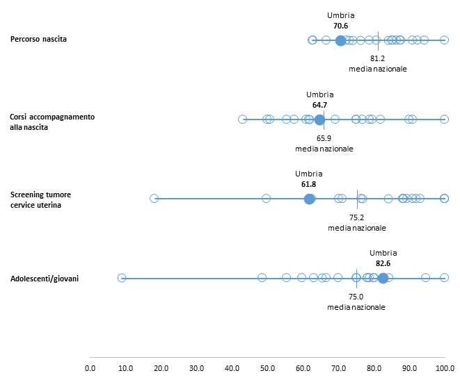 Per la percentuale di CF che svolgono attività nell’ambito dei programmi strategici indicati dal POMI, l’Umbria registra un valore al di sotto della media nazionale per le sedi che seguono tutta la gravidanza (70,6%) mentre è in linea con la media nazionale per le sedi che offrono incontri/corsi di accompagnamento alla nascita (64,7%).