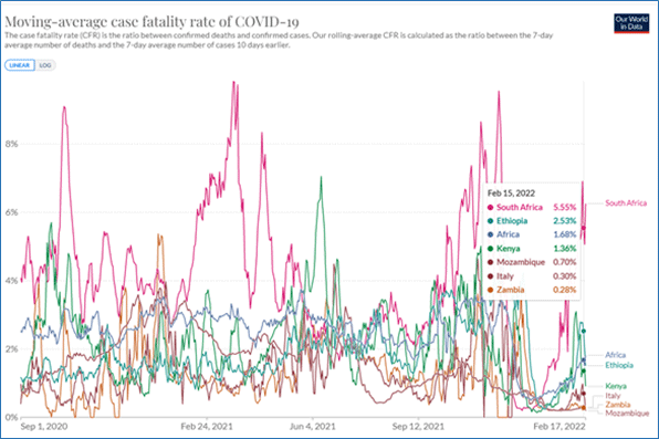 Nel novembre 2021 il Sudafrica si trova a rilevare e affrontare i primi casi di variante Omicron del virus SARS-CoV-2 [7]. Al 15 febbraio 2022, riporta 45,81 casi confermati di COVID-19 per milione di abitanti (fig.1) e 2,72 morti (fig.2). Sono i dati più elevati tra gli altri quattro Paesi ad alta incidenza citati dall’OMS (Zambia, Etiopia, Mozambico e Kenya), con una letalità più alta di cinque volte rispetto a quella italiana e due volte rispetto a quella dell’Etiopia (fig. 3).