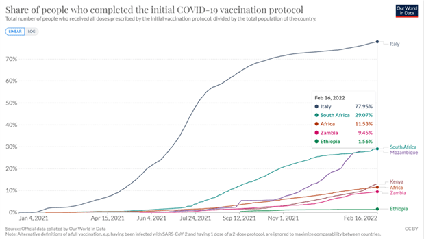 Figura 5. Quota di popolazione vaccinata in Italia, Sudafrica, Zambia ed Etiopia al 16 febbraio 2022