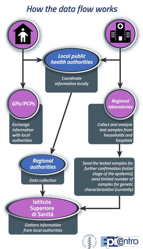 The information used in the national COVID-19 surveillance system comes from a complex data flow starting at the local level. Suspect COVID-19 cases, whether self-isolating at home or hospitalized, undergo SARS-CoV-2 molecular diagnostic testing. Samples are sent to the regional reference laboratories to be analyzed. The results are reported to the Local Health Units (LHUs), which coordinate the data flow between cases, hospitals, General Practitioners (GPs) and Primary Care Paediatricians (PCPs) to gather detailed information on each positive case. The regional coordinators of the COVID-19 epidemiological surveillance will then collect information about the cases from all LHUs.