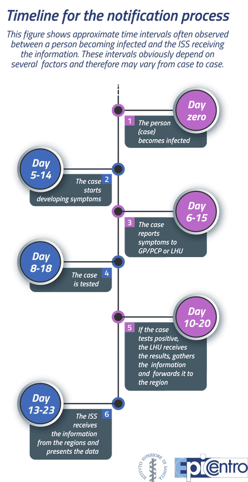 The time lag between the moment a person becomes infected with SARS-CoV-2 and the moment the notification of the disease is recorded in the COVID-19 integrated surveillance system varies considerably, but is on average 2-3 weeks. This depends on a number of factors relating to the characteristics of the infection and the infected person, as well as the organization of local and/or regional health services. In almost all cases, it takes 5 to 14 days for an individual to develop symptoms of the disease (incubation period), and a diagnostic swab test is often carried out only after symptom onset. If the infected person is a close contact of a positive case, they may be tested before developing any symptom, but are unlikely to be diagnosed as positive until after 4-5 days from infection, because the number of virus particles replicating during the first few days is not large enough for them to be detected by current diagnostic tests. If the person has not already been identified as a close contact and does not suspect that they may be infected, they might wait a few days after symptom onset before contacting their GP or visiting an emergency department; based on the symptoms, their severity and an assessment of the possible risk of exposure to SARS-CoV-2, the doctor may wait a few more days before referring the patient for a swab test. The time needed for the test to be performed and for the laboratory to provide a diagnosis will depend on the number of test referrals made in the patient’s area, the available staff and the capacity of the laboratory. Finally, after a positive laboratory result is obtained, there may be a variable delay before the relevant information is sent to the ISS based on the organizational and management procedures in place in the region. Figure 3 is a schematic representation of the timeline for the notification process, showing approximate time intervals from “day zero”, i.e. when the infection occurs.
