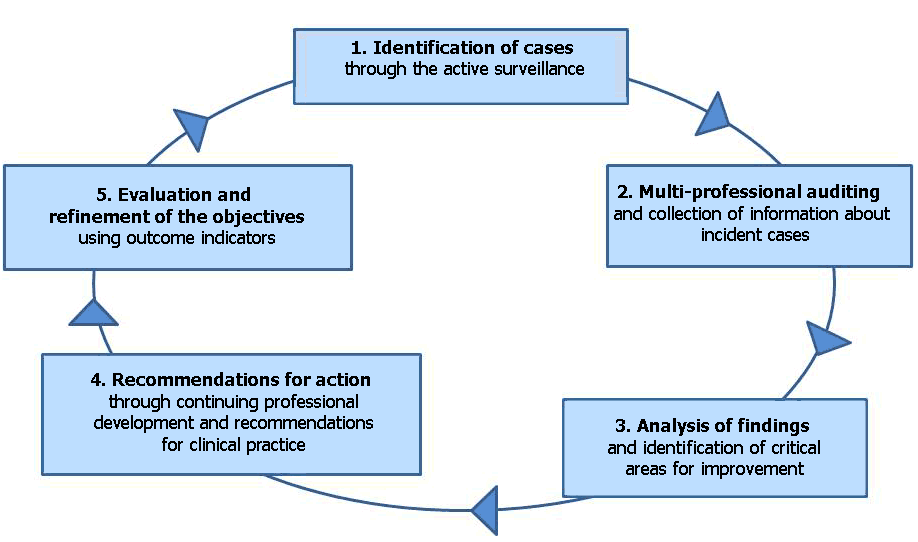 A strategic component of the active surveillance is the internal auditing performed at the facilities where deaths occur. An audit involves: identifying useful or harmful actions that have proved relevant to the outcome of a case; promoting a culture of transparency as the basis for improvement rather than blame; setting up a multi-professional peer group; helping professionals manage stressful events; supporting professional development based on the identification of group and individual needs for further education and training.