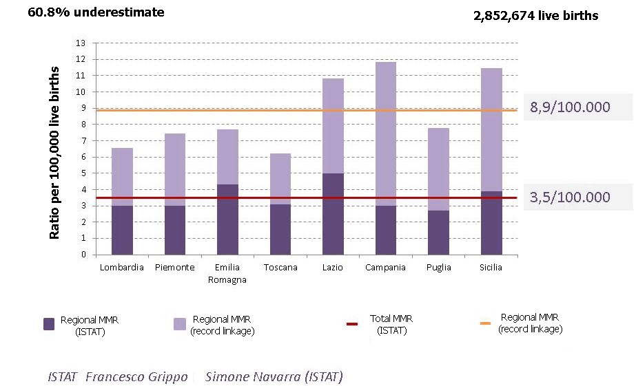 The retrospective approach, which involves linkage of several data sources already available at regional level, provides reliable estimates of the maternal mortality ratio in our country allowing regional comparisons and, thanks to the wide coverage achieved by the system, also international comparisons [9].