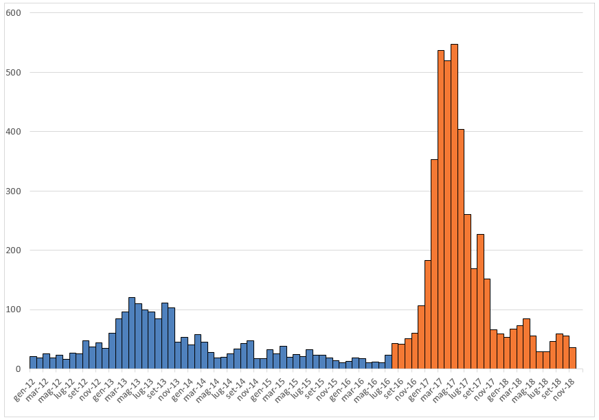 Nel 2018, nonostante l’evidente calo nel numero di casi mensili notificati, la situazione non sembra ancora tornata a livelli pre-epidemici. Per quanto riguarda la distribuzione regionale dei casi, Piemonte, Lombardia, Liguria, Province Autonome di Trento e Bolzano e Toscana presentano ancora un eccesso di casi rispetto al 2015.