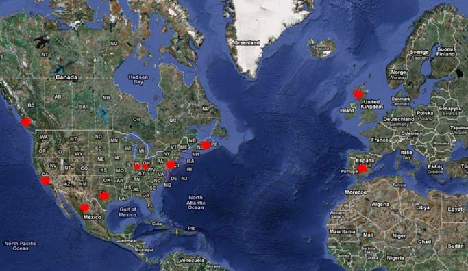Mappa dei focolai epidemici confermati in Messico, Stati Uniti, Canada, Spagna e Scozia