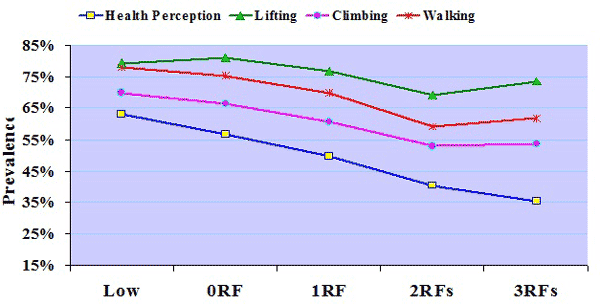 I risultati di queste ricerche sono espressi chiaramente nell’esempio della figura 1, riferita allo studio CHA. Riguardano 2692 donne e 3650 uomini di età 35-64 anni senza malattie di rilievo alla linea base (1967-1973); i sopravvissuti al 26° anno di follow-up sono stati ricontattati e compilato un questionario sulla qualità di vita (HSQ-12). Coloro che alla linea base, cioè in età giovane, presentavano un profilo di rischio favorevole (Low), erano quelli che dichiaravano di avere una qualità di vita eccellente o molto buona, di essere in grado di salire le scale, nel portare la spesa, di camminare; la dichiarazione di questa percezione era meno frequente in coloro che avevano un solo fattore borderline (0RG), o un fattore di rischio (1FR), o 2 fattori di rischio elevati (2FR).