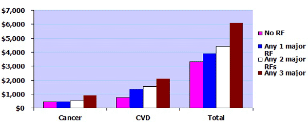 Figura 2. Costo annuale del Servizio sanitario americano (Medicare) (1984-94) per cure in ospedale e fuori ospedale per malattie cardiovascolari (CVD) e tumori (cancer) in base al numero dei fattori di rischio misurati in età media