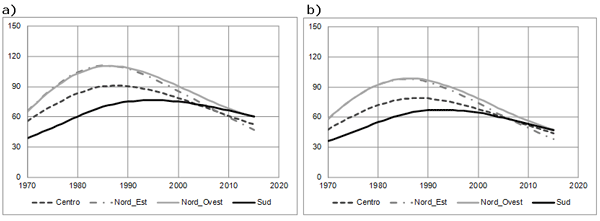 Figura 1. Incidenza (a) e mortalità (b) per tumore del polmone dal 1970 al 2015 per macroarea. Tassi standardizzati per 100.000 (popolazione standard Europea), età 0-99 anni. Uomini