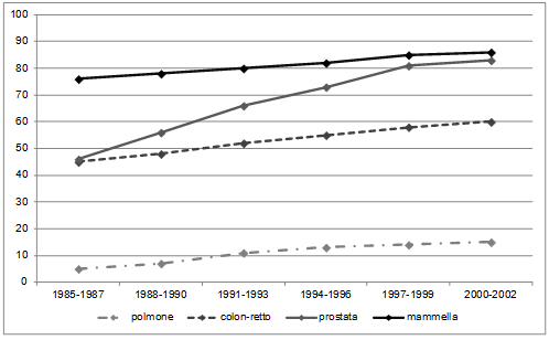Volendo fare un confronto sulla sopravvivenza per i principali tumori, quali polmone, colon-retto, mammella e prostata, i dati più recenti osservati dai Registri tumori italiani mettono in evidenza che la sopravvivenza relativa a 5 anni dalla diagnosi del pool dei Registri, nel periodo 1985-2002, mostra un trend crescente per tutte le sedi considerate, con livelli più elevati per la mammella e più bassi per il polmone (dal 5% al 15% a 5 anni dalla diagnosi) (Figura 3). A livello di area geografica nelle zone del Centro-Nord la sopravvivenza è sostanzialmente omogenea, al Sud, invece, risulta inferiore di circa 4 punti percentuali rispetto alla media dei Registri. [2]