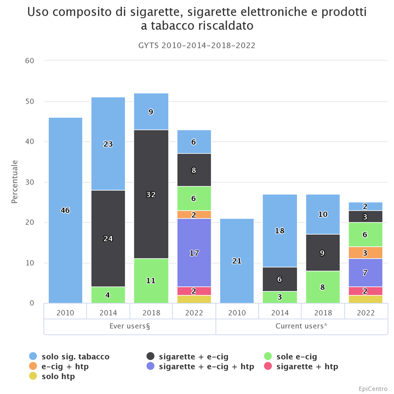 Tra i 13-15enni, dal 2010 al 2022, la quota di current smokers di sigarette tradizionali (cioè fumatori di sigarette in almeno 1 giorno negli ultimi 30) è scesa mediamente dal 21% al 16% (ovvero dal 19% al 13% per i ragazzi e dal 22% al 17% per le ragazze). Si è ridotta anche la quota degli ever smokers di sigarette tradizionali (coloro che hanno fumato almeno una volta nella vita sigarette tradizionali) passando dal 46% del 2010 al 33% del 2022.