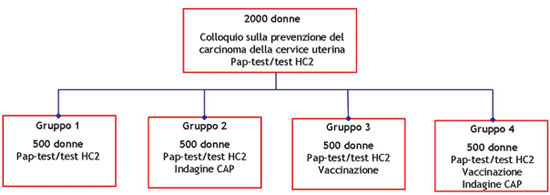 Per raggiungere questi obiettivi, la popolazione in studio è stata suddivisa in 4 gruppi (ognuno dei quali costituito da circa 500 donne) a cui sono state offerte diverse attività (vedi figura):
