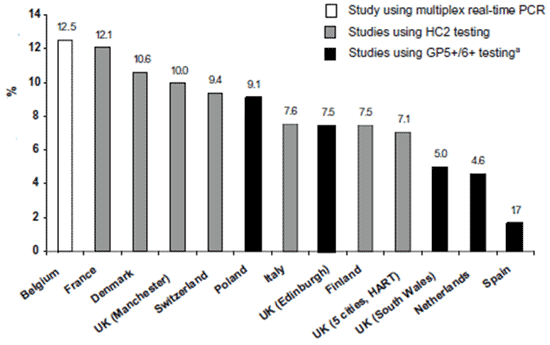 Dalla figura 1 è possibile anche osservare i tassi di prevalenza standardizzati per età, che variano dal 1,7% in Spagna al 12,5% in Belgio in donne di 30-64 anni. Questa prevalenza è stata calcolata sulla popolazione generale senza escludere le donne con anomalie citologiche, assumendo che rappresentino una piccola proporzione di tutte le donne. Va tenuto presente che la variabilità tra studi è influenzata, oltre che dalla popolazione reclutata nei vari studi, anche dal metodo utilizzato per rilevare il Dna virale.