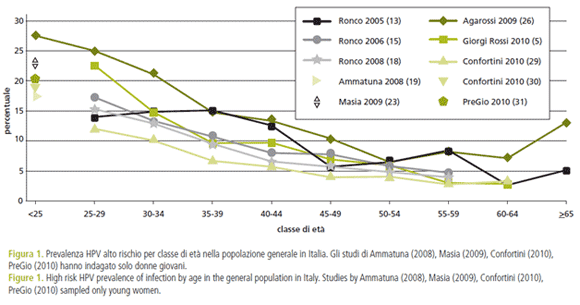 In figura 1 sono riportati gli studi più recenti (2005-2010) della revisione sistematica [1]. Il grafico evidenzia come la prevalenza di Hpv oncogeni sia maggiore nelle donne più giovani, con un picco nelle donne con meno di 25 anni.