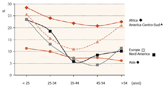 L’intervallo di circa 10 anni tra il secondo incremento della prevalenza rilevato in Nord-America (35-44 anni) e in Europa (45-54 anni) depone a favore di un fattore comportamentale piuttosto che un fattore biologico legato alla menopausa o alla senescenza [2].
