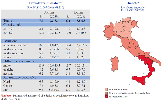 Il fattore maggiormente legato all’insorgenza del diabete è l’età e, in entrambi i generi, si conferma l’associazione di questa patologia con uno stato di svantaggio socioeconomico (basso livello di istruzione e molte difficoltà economiche): sono alcune delle considerazioni che emergono dal capitolo sul diabete (pdf 68 kb) presente all’interno del rapporto Passi “Diseguaglianze sociali e di salute” (pdf 880 kb). Il documento registra come, nonostante i grandi progressi registrati negli ultimi decenni nello stato di salute della popolazione, restano ancora ampie le diseguaglianze di salute tra le classi sociali più svantaggiate e quelle benestanti.