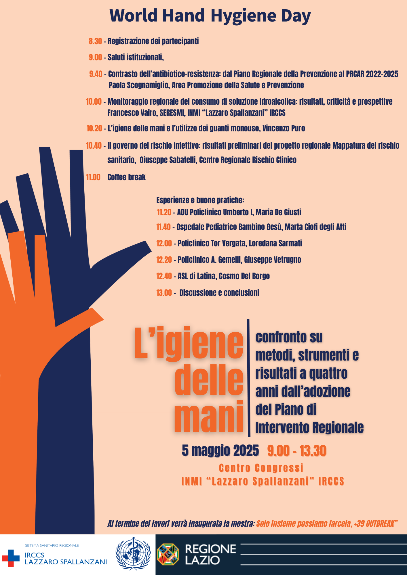 In occasione della Giornata mondiale per l’igiene delle mani 2025 la Regione Lazio in collaborazione con l’Istituto Nazionale Malattie Infettive “Luigi Spallanzani” (INMI) –IRCCS organizza un convegno volto a condividere lo stato di attuazione degli indirizzi regionali in tema di igiene delle mani e di misure di contrasto delle ICA, evidenziando criticità, punti di forza e buone prassi negli Enti del tema sanitario regionale (SSR). Scarica la locandina (png 422 Kb) con il programma dell’evento.