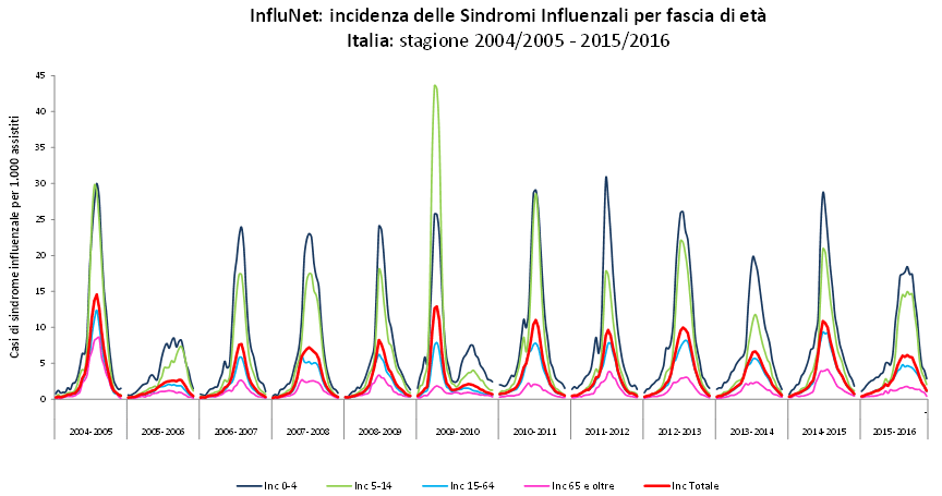 Nella stagione influenzale 2015-2016 la circolazione virale è iniziata più tardi e di conseguenza il picco è stato raggiunto nella seconda settimana di febbraio, due settimane dopo rispetto alle precedenti stagioni influenzali. Il periodo epidemico ha avuto una durata di dodici settimane (dalla settimana 2016-02 alla 2016-13). La curva epidemica ha raggiunto il picco con un livello di incidenza pari a circa 6 casi per mille assistiti, molto inferiore rispetto a quello raggiunto la scorsa stagione (11 casi per mille assistiti). Il picco epidemico è stato uno dei più bassi delle ultime stagioni influenzali e l’influenza ha colpito circa l’8% degli italiani, per un totale di circa 4.900.000 casi dall’inizio della stagione. Questo valore colloca la stagione appena trascorsa ad un basso livello di intensità. Il minimo storico dell’incidenza è stato osservato nella stagione 2005-2006 con 4% di casi nella popolazione, mentre nella stagione 2004-2005 l’incidenza, pari al 12%, ha raggiunto il livello massimo dall’avvio della sorveglianza Influnet.