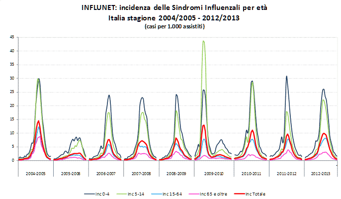 Come ogni anno, anche nella stagione influenzale 2012-2013, la curva epidemica ha raggiunto il picco all’inizio del mese di febbraio con un valore di incidenza pari a 9,97 casi per mille assistiti. Sebbene il picco epidemico non abbia raggiunto uno tra i livelli più elevati, l’influenza ha colpito il 10,5% degli italiani, per un totale di circa 6.166.000 casi dall’inizio della stagione. Questo valore si colloca a un livello intermedio rispetto a quello osservato nella stagione 2005-2006, in cui è stato registrato il minimo storico di attività influenzale (4%) e quello osservato nella stagione 2004-2005 in cui l’incidenza ha raggiunto il massimo livello dall’avvio della sorveglianza (12%).