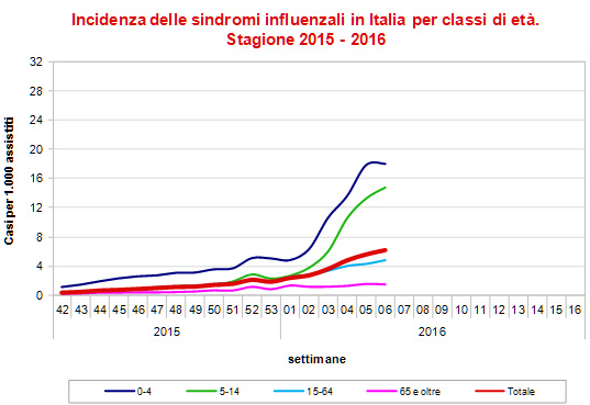 La stagione influenzale è iniziata in ritardo rispetto alla scorsa stagione, il periodo epidemico, infatti, è iniziato a metà gennaio 2016 e il numero dei casi è cominciato a crescere fino a raggiungere il picco stagionale nella sesta settimana del 2016 (8-14 febbraio) con un valore di incidenza pari a circa 6 casi per 1000 assistiti. Più di due milioni di italiani, fin ora, sono stati colpiti dai virus influenzali. Sebbene è ancora prematuro fare un bilancio dell’intera stagione, l’incidenza fin ora raggiunta colloca la stagione a un livello basso di intensità raggiunta.