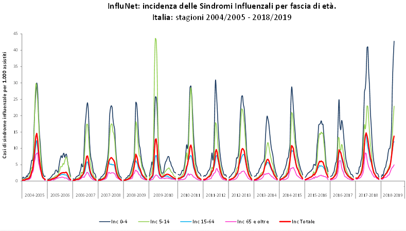 Da un primo bilancio della stagione influenzale in corso emerge che è stata caratterizzata da un periodo iniziale di bassa incidenza, che si è protratto fino alla fine di dicembre 2018, e da un intensificarsi dell’attività virale con l’inizio del nuovo anno. Infatti, nelle prime cinque settimane del 2019 l’incidenza è aumentata fino al raggiungimento del picco epidemico, con un livello pari a circa 14 casi per mille assistiti, valore che colloca la stagione a un livello di “alta intensità”.
