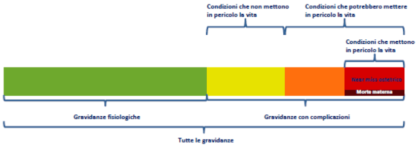 La Figura 1 illustra lo spettro della morbosità materna e le relazioni tra complicanze ostetriche, near miss e morte materna.