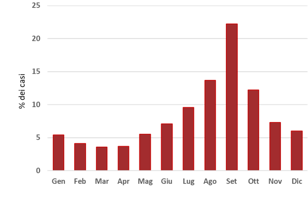 L’andamento dei casi mostra un aumento tra luglio e ottobre, periodo che corrisponde ai viaggi effettuati durante le vacanze estive. Un secondo picco, seppur meno marcato, si registra tra dicembre e gennaio, in concomitanza con i viaggi legati alle festività di fine anno (Figura 2).