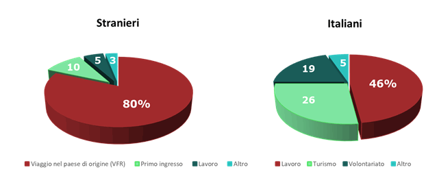 Il motivo del viaggio in aree endemiche per gli italiani include principalmente viaggi per lavoro (46%), seguito da turismo (26%) e da attività di volontariato/missione religiosa (19%). Gli stranieri, invece, presentano come principale motivo i brevi soggiorni nei loro Paesi di origine (80%) (VFRs), mentre per il 13% sono al primo ingresso in Italia (Figura 4).