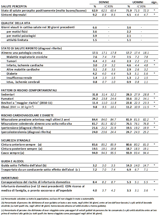 Le differenze di genere nella salute percepita e nei sintomi depressivi sono confermati anche con analisi multivariate che controllano per caratteristiche socio-anagrafiche (età , titolo di studio, difficoltà economiche, cittadinanza, stili di vita e patologie croniche da diagnosi riferita). Alla peggiore percezione dello stato di salute, non corrisponde tuttavia una maggiore prevalenza di diagnosi di patologie croniche: la frequenza di persone che riferisce di aver ricevuto da un medico almeno una fra le diagnosi di patologie croniche indagate da Passi (tumori, cardiopatie, malattie respiratorie, ischemie cerebrovascolari, malattie croniche del fegato, diabete e insufficienza renale) è analoga fra uomini e donne (pari a circa il 18%), tuttavia significativamente più alta risulta la prevalenza di donne che riferisce una diagnosi tumorale (4,4% vs 2,3%) mentre significativamente più basse le prevalenze di donne che riferiscono un infarto/ischemia cardiaca e una diagnosi di diabete (rispettivamente nelle donne 3,0% e 4,2%, e negli uomini 4,6% e 5,3%).