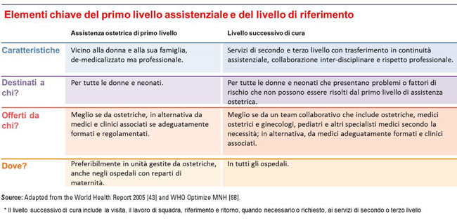 - Per consentire alle ostetriche di lavorare efficacemente, i servizi devono essere attrezzati per offrire servizi appropriati, incluse le emergenze (trasfusione di sangue, taglio cesareo, rianimazione neonatale).