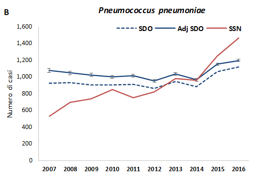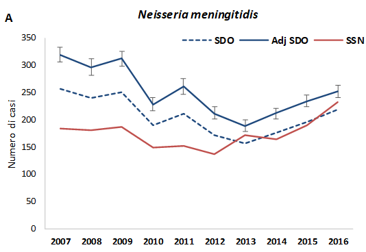 Ssn, Sistema di Sorveglianza Nazionale; Sdo, Schede di dimissione ospedaliera che includono le Mib “riclassificate” dal codice generico ICD-9-CM 320.9 “meningite batterica non specificata” I casi con una diagnosi di dimissione ospedaliera di “meningite batterica non specificata” (22% di tutte le meningiti) sono stati attribuiti ad uno specifico agente eziologico utilizzando un modello di regressione logistica multinomiale, considerando come fattori prognostici la classe di età, il genere, la nazionalità, l’area geografica di residenza, il mese di ricovero, l’anno di dimissione.