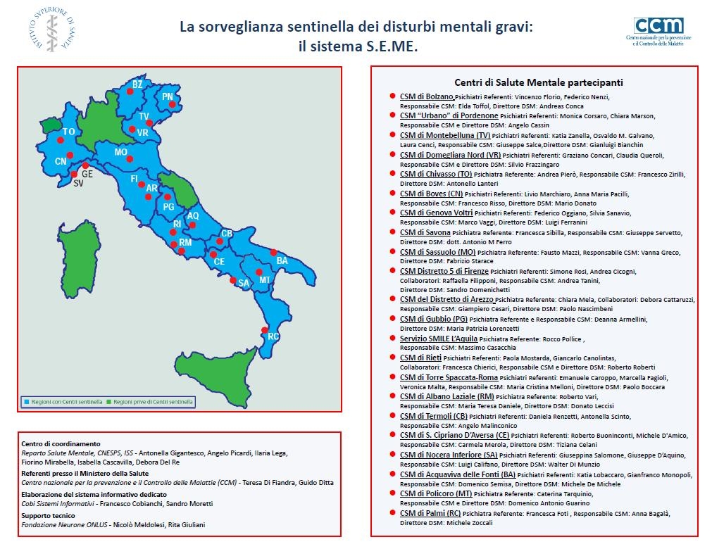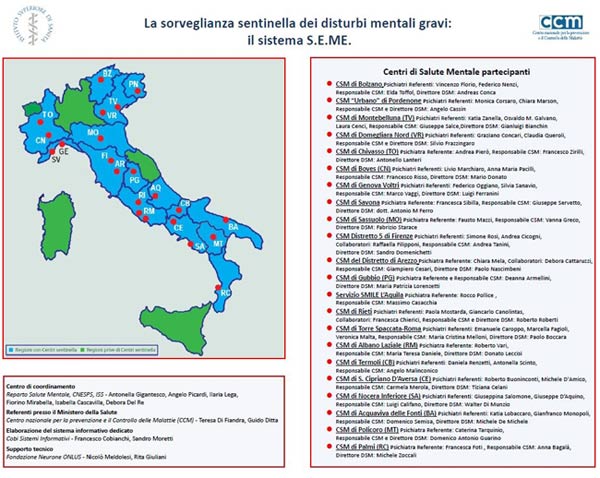 - Sorveglianza sentinella dei disturbi mentali gravi e dei casi di suicidio: il progetto Seme - Obiettivi, metodologia, risultati (pdf 1,7 Mb) Antonella Gigantesco - reparto Salute mentale (Cnesps-Iss)