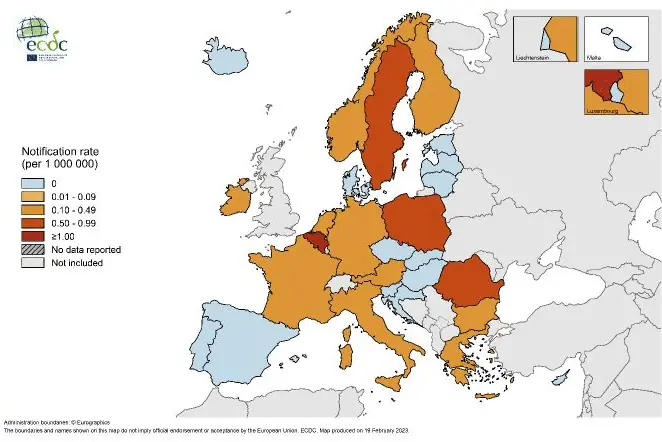 Figura 1: tassi di notifica (per 1.000.000) per Paese UE/SEE nel 2022. Fonte: ECDC