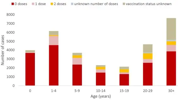 L’età mediana dei casi in tutti i paesi UE/SEE che hanno segnalato casi è stata pari a cinque anni (intervallo interquartile IQR: 5–44). In confronto, durante il periodo 2018-2021, l’età mediana dei casi era compresa tra gli 8 e i 19 anni.