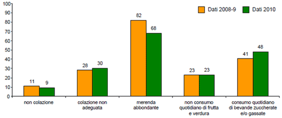 La raccolta dati 2010 ha confermato la grande diffusione tra i bambini di abitudini alimentari che non favoriscono una crescita armonica e che predispongono all’aumento di peso, specie se concomitanti. In particolare, è emerso che il 9% dei bambini salta la prima colazione e il 30% fa una colazione non adeguata (ossia sbilanciata in termini di carboidrati e proteine); il 68% fa una merenda di metà mattina troppo abbondante, mentre il 23% dei genitori dichiara che i propri figli non consumano quotidianamente frutta e/o verdura e il 48% consuma quotidianamente bevande zuccherate e/o gassate.