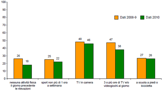 Anche i dati raccolti sull’attività fisica sono poco confortanti: il 22% dei bambini pratica sport per non più di un’ora a settimana e il 18% non ha fatto attività fisica il giorno precedente l’indagine. Inoltre, la metà circa dei bambini ha la TV in camera, il 38% guarda la TV e/o gioca con i videogiochi per 3 o più ore al giorno e solo un bambino su 4 si reca a scuola a piedi o in bicicletta.