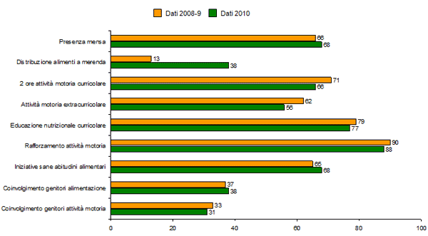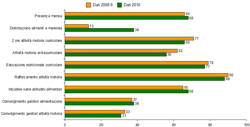 Grazie alla partecipazione attiva dei dirigenti scolastici e degli insegnanti, sono stati raccolti dati su 2.222 plessi di scuole primarie italiane, relativamente alla struttura degli impianti, ai programmi didattici, alle iniziative di promozione della sana nutrizione e dell’attività fisica degli alunni. È emerso che solo il 68% delle scuole possiede una mensa; il 38% prevede la distribuzione per la merenda di metà mattina di alimenti salutari (frutta, yogurt ecc.); il 34% delle classi svolge meno di due ore di attività motoria a settimana. Inoltre, solo 1 scuola su 3 ha avviato iniziative favorenti una sana alimentazione e l’attività motoria, con il coinvolgimento dei genitori.