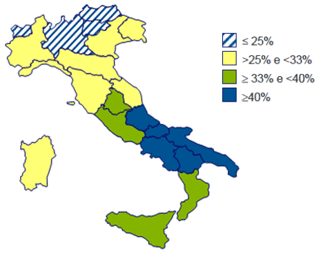 Sovrappeso+obesità per regione, bambini di 8-9 anni della 3a primaria, OKkio alla SALUTE 2012