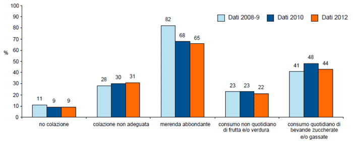 La rilevazione 2012, confermando i dati precedenti, ha messo in luce la grande diffusione tra i bambini di abitudini alimentari che possono favorire l’aumento di peso, specie se concomitanti. In particolare, è emerso che il 9% dei bambini salta la prima colazione e il 31% fa una colazione non adeguata (ossia sbilanciata in termini di carboidrati e proteine); il 65% fa una merenda di metà mattina abbondante, mentre il 22% dei genitori dichiara che i propri figli non consumano quotidianamente frutta e/o verdura e il 44% consuma abitualmente bevande zuccherate e/o gassate.