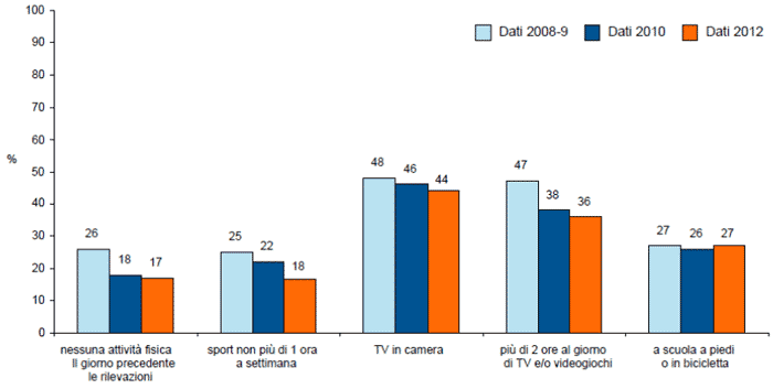 Anche i valori dell’inattività fisica e dei comportamenti sedentari, pur mostrando un miglioramento, permangono elevati: il 17% non ha fatto attività fisica il giorno precedente l’indagine, il 18% pratica sport per non più di un’ora a settimana, il 44% ha la TV in camera, il 36% guarda la TV e/o gioca con i videogiochi più di 2 ore al giorno e solo un bambino su quattro si reca a scuola a piedi o in bicicletta.