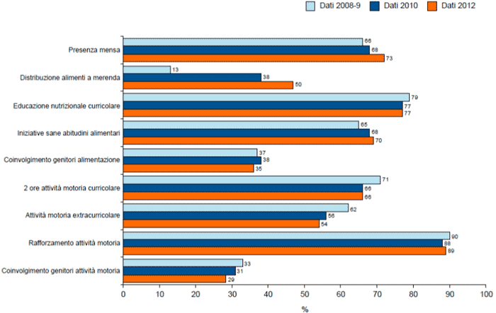 Grazie alla partecipazione attiva dei dirigenti scolastici e degli insegnanti, sono stati raccolti dati in 2.355 plessi di scuole primarie italiane, relativamente alla struttura degli impianti, ai programmi didattici, alle iniziative di promozione della sana nutrizione e dell’attività fisica degli alunni. È emerso che il 73% delle scuole possiede una mensa; il 50% prevede la distribuzione per la merenda di metà mattina di alimenti salutari (frutta, yogurt ecc.); il 34% delle classi svolge meno di due ore di attività motoria a settimana. Inoltre, solo 1 scuola su 3 ha coinvolto i genitori in iniziative favorenti una sana alimentazione e 1 su 4 in quelle riguardanti l’attività motoria.