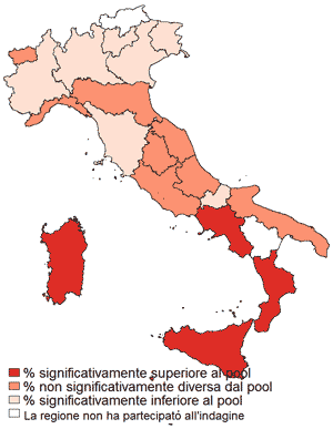 - L’analisi della distribuzione regionale mostra differenze anche molto marcate fra le Regioni con un gradiente di maggiore gravità fra Nord e Sud. Nelle Isole si rilevano le percentuali maggiori: 34% in Sicilia e 33% in Sardegna, seguono la Campania e la Calabria dove si registra il 30%. In Molise si riscontra la prevalenza più bassa pari al 13%. Sono positivi anche dati raccolti nelle Asl di Milano e Triestina dove si rilevano rispettivamente il 12% e 11%.