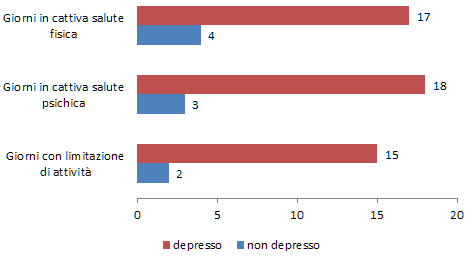 - Anche la salute fisica, oltre quella psicologica, delle persone che riferiscono sintomi depressivi risulta decisamente compromessa se paragonata al resto della popolazione adulta: nel mese precedente l’intervista le prime dichiarano mediamente molti più giorni vissuti in cattive condizioni fisiche (17 giorni vs 4 giorni), in cattiva salute psicologica (18 vs 3) e molti più giorni con limitazione delle abituali attività, a causa dello stato fisico e psicologico (15 vs 2).