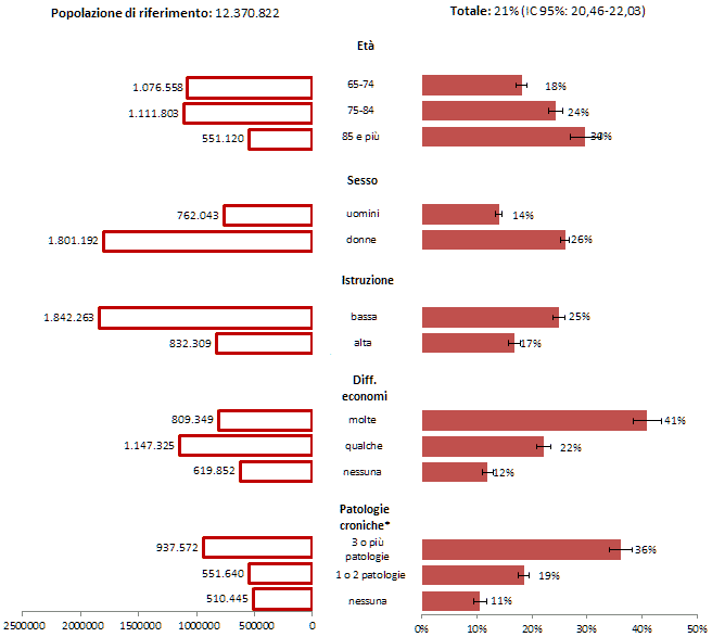 - La depressione, uno dei 4 “giganti” della geriatria, così come definiti dall’Oms, è presente tra gli anziani intervistati in misura del 21%, maggiore nelle classi d’età 75 e più rispetto ai 65-74 (25% vs 18%), con notevoli differenze per genere (uomini 14% vs donne 26%). Anche per la depressione sembra pesare molto la differente percezione sulle difficoltà economiche: presente nel 12% di coloro che sentono di arrivare a fine mese con nessuna difficoltà, si riscontra nel 22% e nel 41% per chi rispettivamente percepisce qualche e molte difficoltà economiche. La prevalenza di persone con sintomi depressivi è maggiore tra chi riferisce diagnosi di patologia cronica: 36% nei casi in cui le patologie sono 3 o più, 19% tra coloro che ne riportano 1 o 2 e 11% tra coloro che dichiarano di non avere patologie croniche. Soffrono di sintomi di depressione il 59% degli anziani che non sono autonomi nello svolgere 1 o più attività della vita quotidiana di base (Adl) contro il 18% di chi è autonomo in tutte le ADL e il 43% di quelli non autonomi in almeno 1 attività strumentale (Iadl) contro il 14% di chi è autonomo in tutte le Iadl.